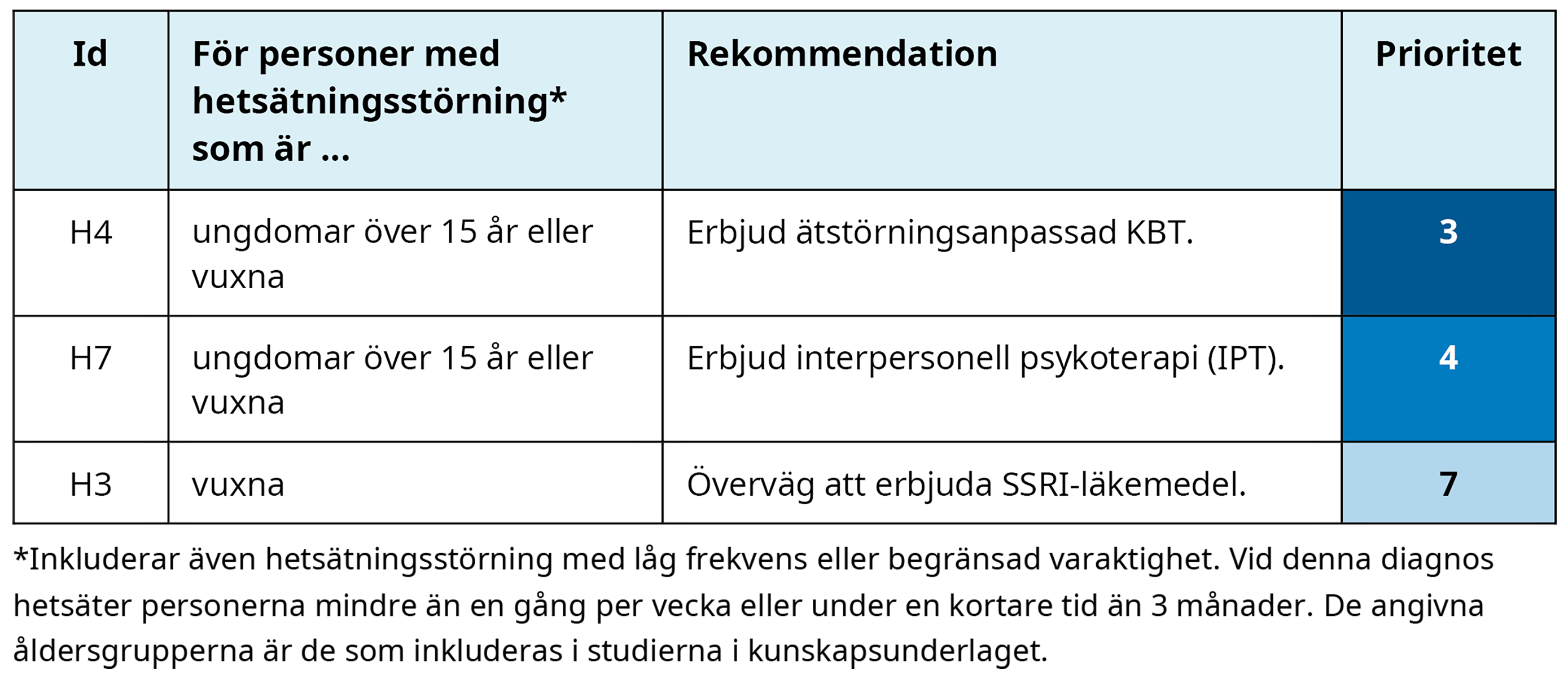 Personer med hetsätningsstörning har ett hälsotillstånd med en stor svårighetsgrad. Högst prioriterat för dessa patienter är psykologisk behandling i form av ätstörningsanpassad KBT, tätt följt av IPT.
